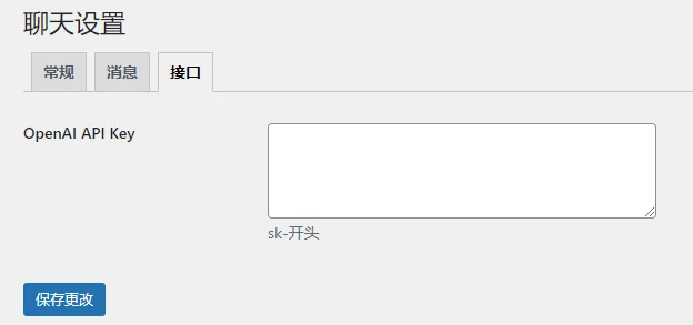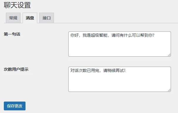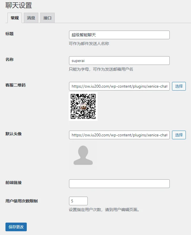 安装并启用插件后,进入 WordPress 后台 【设置】→【聊天】,即可看到完整的聊天配置页面,包括: